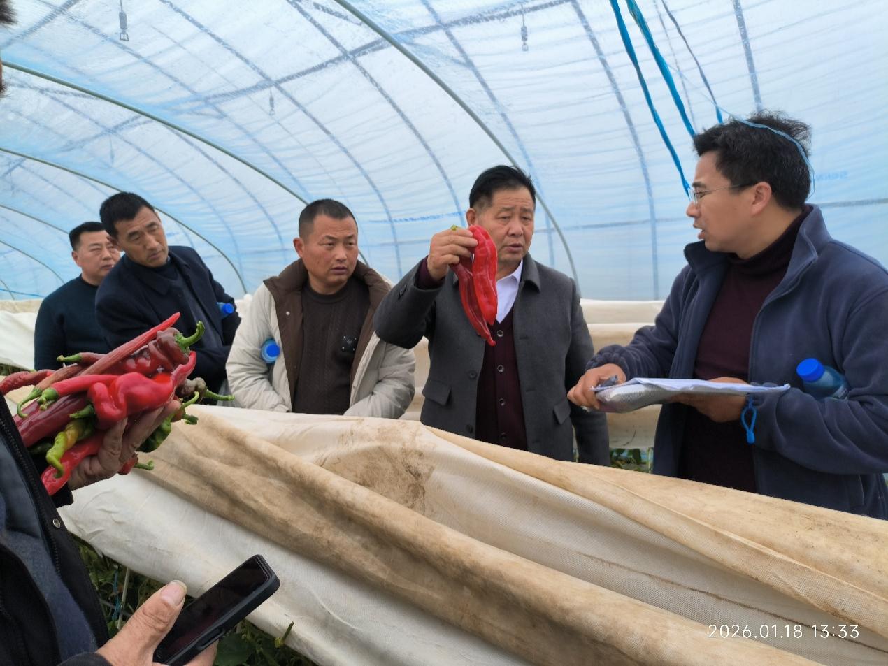 为赋能亭湖区羊角椒产业升级,精准对接育种科研与田间生产, 1月18日,新洋基地组织7名亭湖辣椒种植大户,赴我院六合辣椒选育基地开展辣椒观摩与品鉴活动。辣椒创新团队带头人刁卫平研究员全程对接,以“科研+农户”面对面模式,筑牢产学研助农纽带。