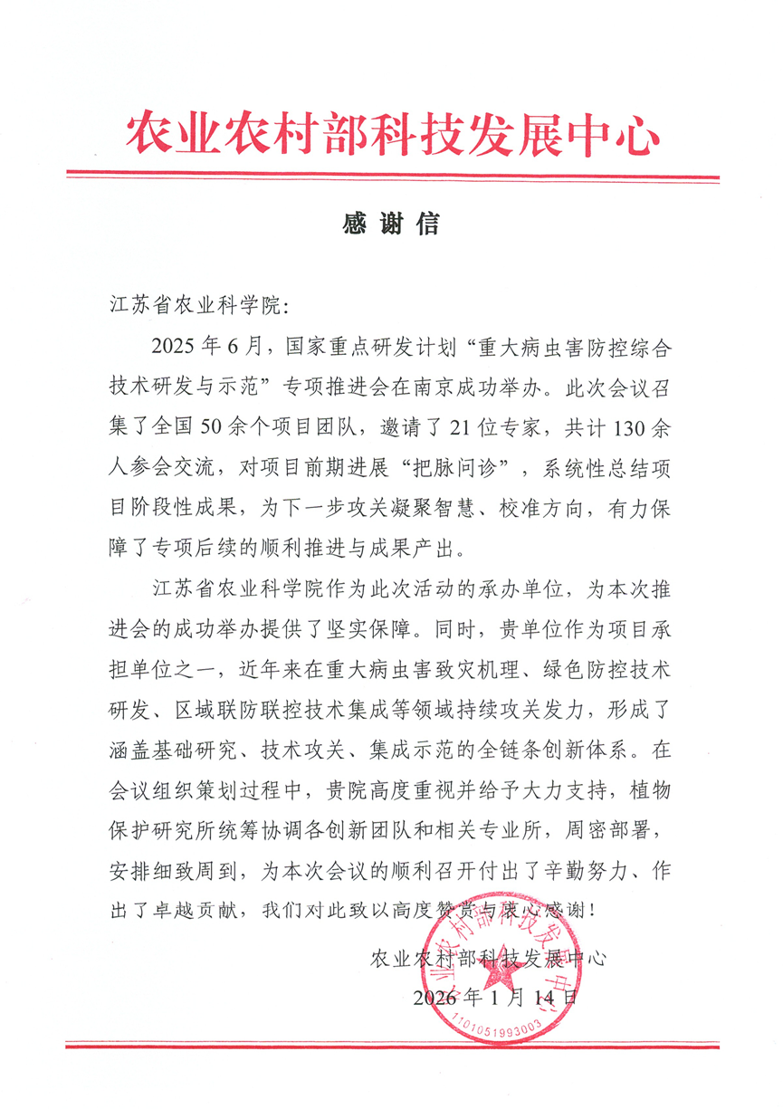 下一步,植物保护研究所将以此次感谢信为鞭策与动力,持续深耕重大病虫害防控综合技术研发与示范等核心工作,不忘初心、砥砺奋进,为加快推进高水平农业科技自立自强、助力农业强国建设贡献更大力量。