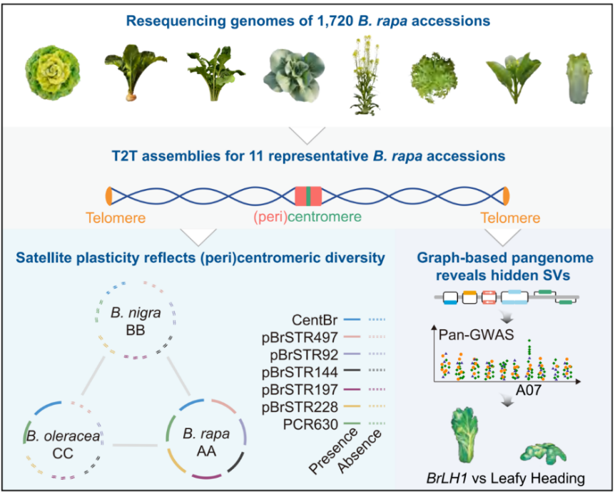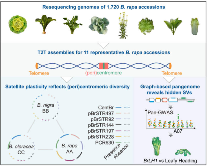 白菜是中国第一大蔬菜作物,几千年间快速分化出众多亚种,包括叶用大白菜、普通白菜、乌塌菜、薹用菜心、根用芜菁、油用白菜型油菜等,形态各异,却同属一个种,堪称“作物界快速分化的范例”,也让白菜成为探究“达尔文之谜”的模式物种。本研究对1720份白菜进行重测序,筛选7个亚种11份代表性材料进行完整基因组组装,并识别出110个着丝粒,同时挖掘到5个与物种形成和分化密切相关的着丝粒特异卫星重复序列(satellites);在此基础上,结合 31 份白菜基因组构建图泛基因组,系统解析了着丝粒重塑与大规模结构变异对白菜亚种快速分化的共同作用;并通过泛基因组关联分析与突变体功能验证,锁定控制叶球形成的关键基因BrLH1,将具体亚种的形成与泛遗传变异直接关联起来,为理解被子植物实现快速多样化提供了基因组学支撑。