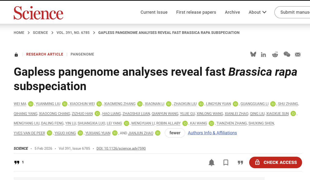 2026年2月6日,太湖所蔬菜团队与河北农业大学赵建军教授团队等国内外多家科研院所合作,在国际顶尖学术期刊《Science》发表题为“Gapless pangenome analyses reveal fast Brassica rapa subspeciation”的研究论文,为破解达尔文提出的“被子植物为何能在地球上迅速崛起、并在极短地质时间内完成爆发式多样化”这一悬而未决的“恼人之谜”提供了新的基因组学视角:以一棵看似普通的白菜(Brassica rapa)为切入口,系统描绘了“白菜王国”如何从一个共同祖先演变为“诸侯并立”的多亚种格局,构建了一个将经典进化问题落地到具体作物系统的基因组学研究范例。