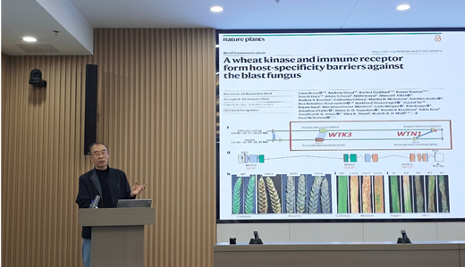 报告中,刘志勇研究员系统分享了其团队围绕小麦不同病害防控的产业需求,从小麦主栽品种、地方品种和野生二粒小麦中发掘抗病基因,并应用于种质创新的科研历程和系列原创性成果。在抗病基因发掘方面,团队先后从主栽品种中发掘出抗条锈病近免疫分子模块“1347B”,克隆了抗叶锈病/杂种坏死基因Lr13/Ne2(NLR)、杂种坏死基因Ne1(ABH)、抗白粉病基因Pm52(NLR-PRK)等;从地方品种中克隆了抗白粉病基因RXL/Pm5e(NLR pair)、Pm24(WTN1-WTK3 pair)等;从野生二粒小麦中克隆了抗白粉病基因Pm41(NLR)、Pm36(WTK7-TM)、Pm26(NLR pair)、PmWR183(NLR pair)等;此外还克隆了小麦自发免疫多抗基因WAI-A1、WAI-D1、WAI-B2、WAI3、WAI-A4等。相关研究成果发表于Science、Cell、Nature Genetics等国际顶级学术期刊。在种质创新与育种利用方面,团队通过在主栽品种中聚合多个抗病基因,成功培育出“科麦1609”、“中科366”等高产多抗小麦新品种,为小麦抗病育种提供了坚实的种质支撑。
