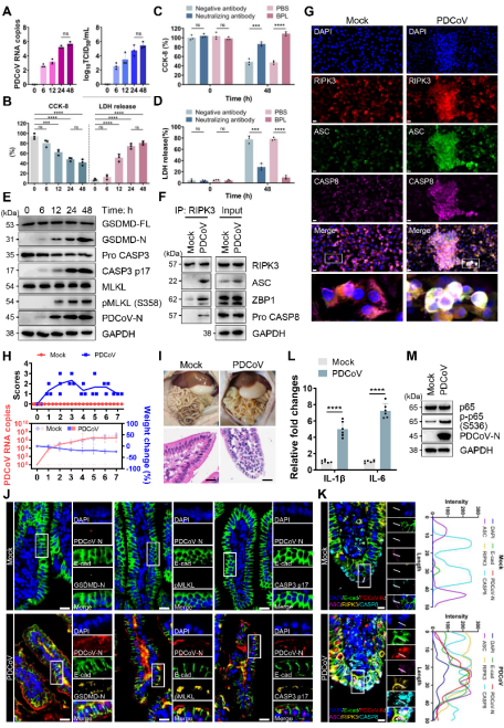 研究团队首先证实,PDCoV感染猪肠上皮细胞(IPEC-J2)可同时激活GSDMD切割、Caspase-3活化和MLKL磷酸化,且RIPK3与Caspase-8、ASC、ZBP1形成复合物,表明PDCoV诱导典型的PANoptosis。在仔猪感染模型中,小肠上皮细胞同样检测到PANoptosis标志物的表达及PANoptosome组分的共定位,证实该过程在体内外保守存在。