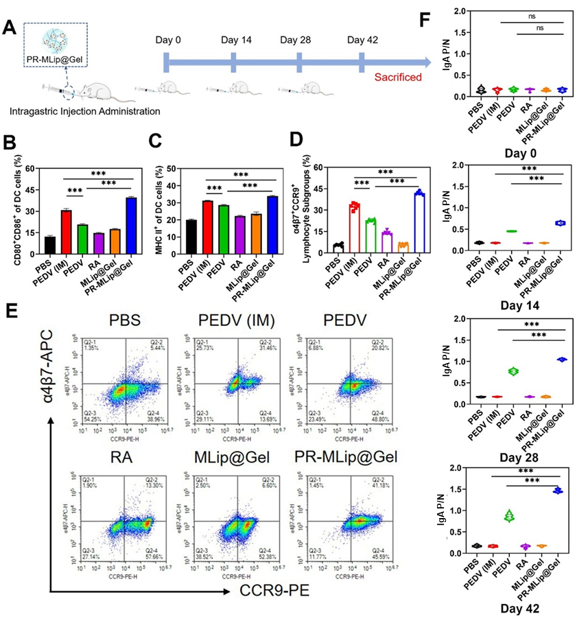 在小鼠免疫实验中,PR-MLip@Gel口服疫苗展现出远超传统免疫方式的免疫激活效果。该疫苗可显著促进肠道淋巴细胞中肠道归巢受体 α4β7 与 CCR9 的高表达,有效驱动免疫细胞向肠道黏膜位点迁移;同时在小鼠血清、粪便及肠道灌洗液中均诱导出高水平的PEDV特异性IgA抗体,显著优于肌肉注射免疫组,成功激活了强效的肠道黏膜免疫应答(图3)。