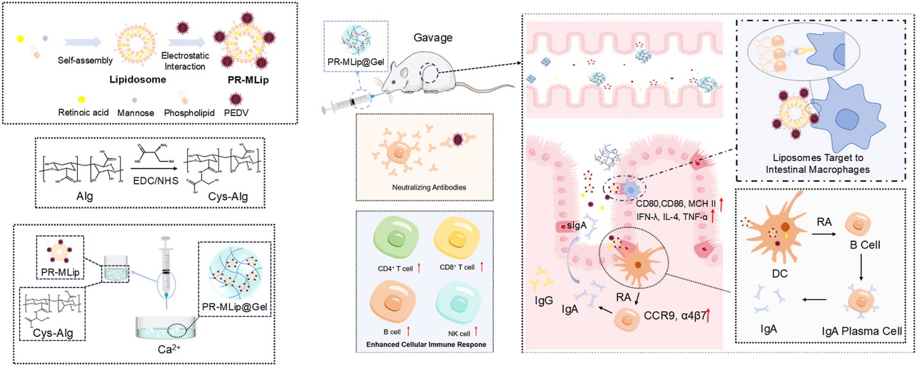 该研究针对口服疫苗研制的核心技术瓶颈,创新开发了一种基于脂质体凝胶微球的新型口服疫苗递送平台:将甘露糖修饰的阳离子脂质体与PEDV抗原、免疫佐剂视黄酸(RA)复合后,完整包裹于巯基化海藻酸钠凝胶微球中,成功构建出PR-MLip@Gel口服疫苗体系(图1)。该体系通过多重功能设计协同突破口服疫苗应用壁垒:甘露糖修饰的脂质体可通过静电作用高效吸附PEDV抗原,精准靶向肠道巨噬细胞与抗原递呈细胞,显著提升抗原摄取效率;巯基化修饰的海藻酸钠凝胶微球作为保护外壳,可有效抵御胃酸环境对抗原的降解破坏,同时大幅增强疫苗在肠道黏膜的黏附能力,延长抗原肠道滞留时间;体系共载的视黄酸可有效促进分泌型IgA产生细胞的分化,进一步放大肠道黏膜免疫应答。