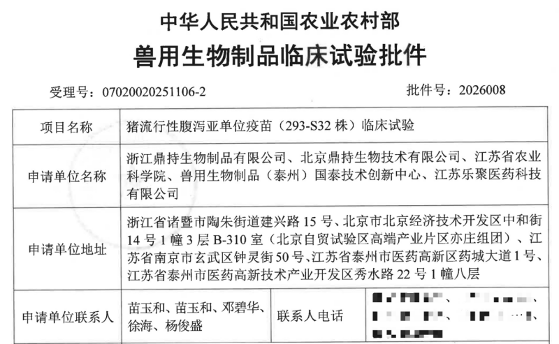 近日,江苏省农业科学院联合浙江鼎持生物制品有限公司、北京鼎持生物技术有限公司、兽用生物制品(泰州)国泰技术创新中心及江苏乐聚医药科技有限公司共同申报的猪流行性腹泻亚单位疫苗(293-S32株),获得中国农业农村部颁发的临床试验批件(批件号:2026008)。