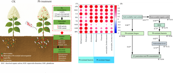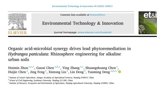 此外,团队还在《Environmental Technology & Innovation》(JCR 1区,IF=7.1)发表了题为“Organic acid-microbial synergy drives lead phytoremediation in Hydrangea paniculata: rhizosphere engineering for alkaline urban soils”的研究论文,首次阐明了圆锥绣球在碱性铅污染土壤中,通过根系分泌有机酸协同富集耐铅功能微生物,构建植物-微生物联合修复网络、降低土壤有效态铅含量的根际调控机制。
