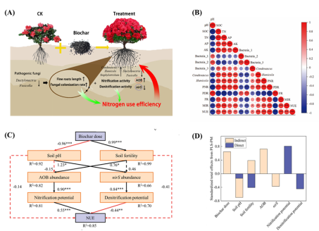 近期,休闲所花卉创新团队在《Journal of Environmental Management》(JCR 1区,IF=8.4)发表了题为“Biochar altered microbial nitrogen transformation and enhanced plant nitrogen utilization efficiency in an alkaline soil”的研究论文,首次系统揭示了弱酸性生物炭通过重塑根际功能微生物群落、定向调控无机氮转化路径,提升嗜酸植物杜鹃在碱性城市土壤中氮素利用效率与根系生长的微生态机制。