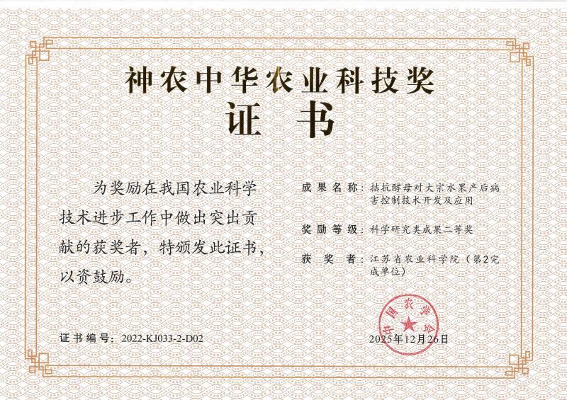 近日,中国农学会公布了2022—2023年度神农中华农业科技奖评审结果。由江苏大学牵头、江苏省农业科学院作为第二完成单位参与的成果“拮抗酵母对大宗水果产后病害控制技术开发及应用”荣获科学研究类成果二等奖。